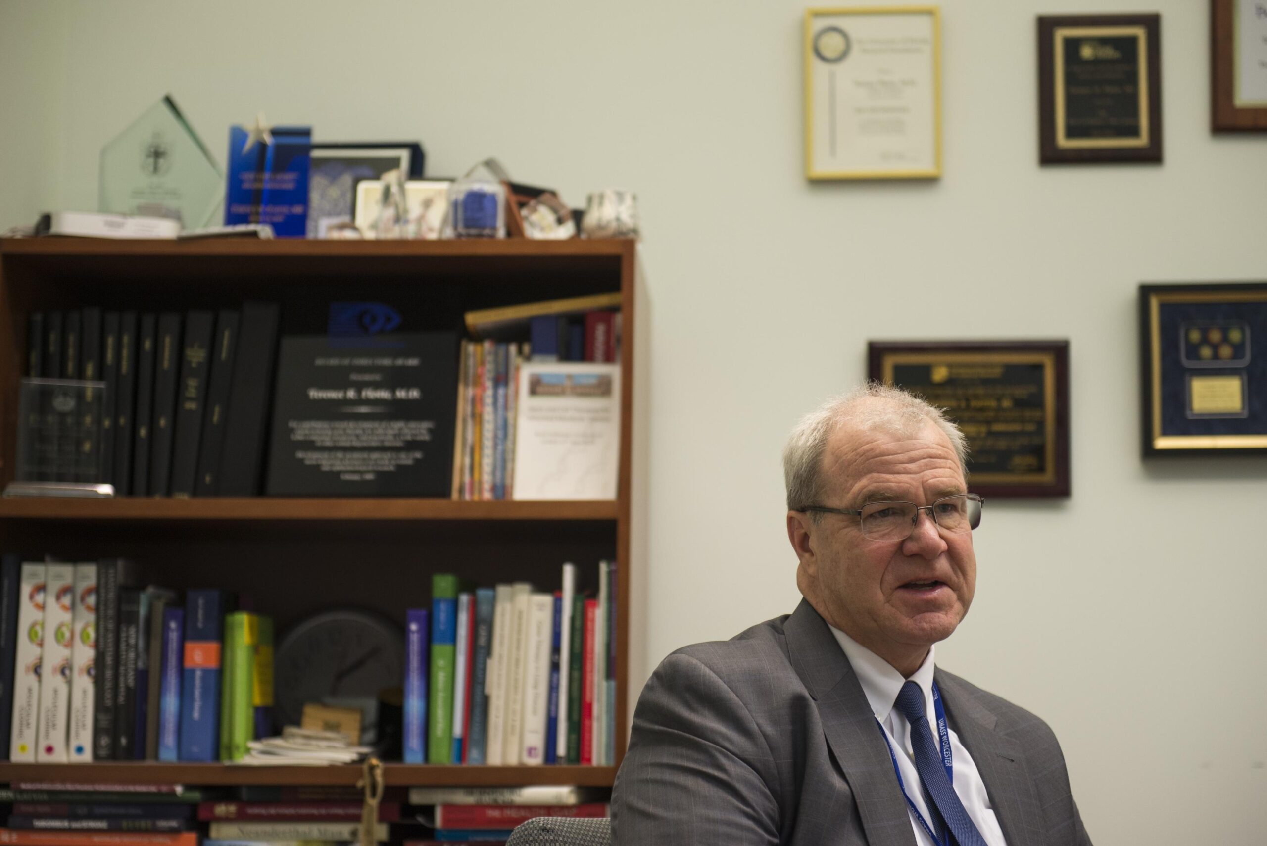 UMass Medical School Dean Dr. Terence R. Flotte is interviewed in his office about a UMass study on investigational genet therapy in two patients with infantile Tay-Sachs disease. [Photo/Sam Fuller]